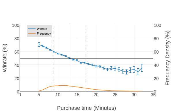我们也调查了一些物品的购买时间,较早的购买时间似乎会导致胜率降低。