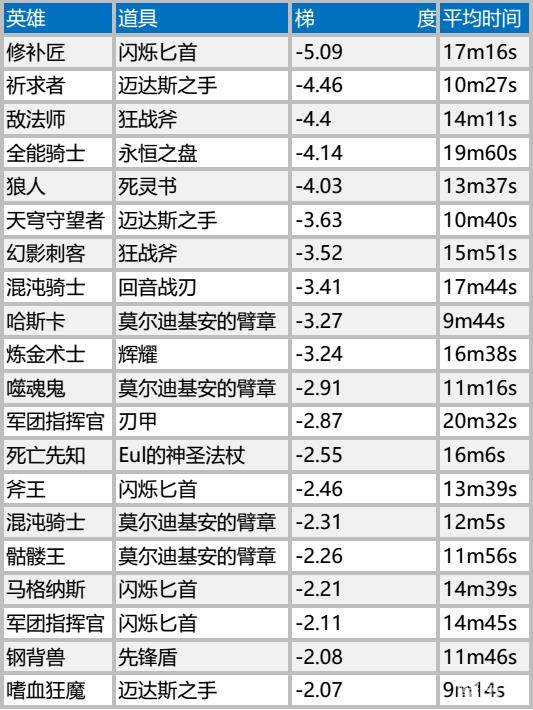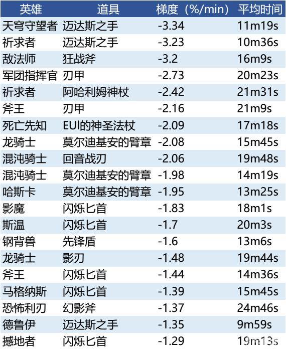 1. 在更高水平的比赛中,大部分的英雄-物品配对仍然在列,敌法师的狂战斧和祈求者的点金手仍然位居前三。