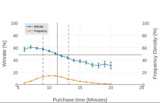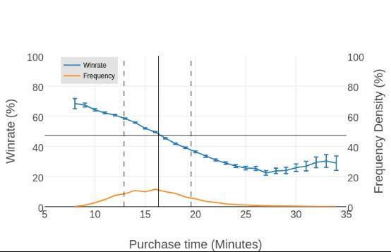 对于一个-2%/min胜率梯度,平均购买时间约为15分钟的英雄-物品配对(以龙骑士的臂章为例),这意味着如果你晚5分钟,即在20分钟时购买臂章,你的胜率将会降低10%。
