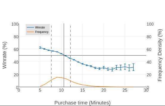 当我们展开对“晚一分钟购买一个物品会对胜率有多大影响?”问题的研究时,我们认为胜率下降得越快,这个物品对于赢下比赛来说就越重要。