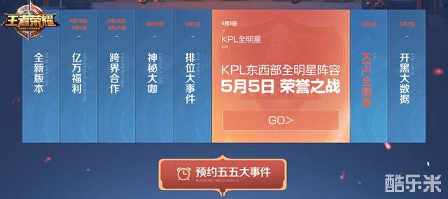 5月5日17:00,上海静安体育中心体育馆,《王者荣耀》东西部明星对抗赛将震撼来袭,由玩家票选出的明星赛阵容,将在这个夜晚,疯狂厮杀,争夺“KPL之星”荣誉奖牌。现场还有超人气解说,将为各位召唤师们带来如职业联赛一般的观赛体验!