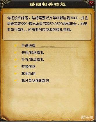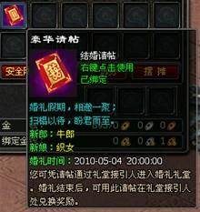 登记结婚后,想要举行婚礼的玩家(等级需至少达到30级),携带99颗情比金坚石和52金组队到长安NPC“结婚月老”(137,291)处进行登记结婚,情比金坚石完成“御花园副本”即可获得,商城里也有出售。选择举行婚礼的时间和婚礼规模,每个阵营在每个时间段只举行一场婚礼,到时候,谁会是那对羡煞旁人的神仙眷侣呢?