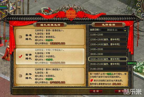 婚礼分为普通、富贵、豪华三种类型。对应的婚礼游行队伍阵容、婚礼惊喜也有不同。