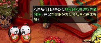 进入礼堂之后,新郎和新娘的游戏界面上就会出现“拜堂“按钮,点击此按钮之后,就可以开始婚礼的最高潮环节——拜堂成亲了!建议等亲朋好友都聚齐之后再拜堂哦!祝愿所有玩家都拥有一个自己的永难忘怀的婚礼。