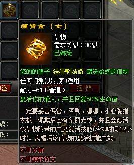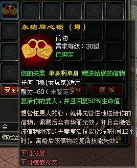 玩家在结婚之时,还可交换西游记中的定情信物,此宝不仅是您感情的见证,更可装备在装备栏的“信物“栏中,不仅拥有优秀的附加属性,还有一样可以复活自己爱人的技能(装备信物之后,将图标拖拽到技能栏中使用),在今后的游戏中可是有不小作用的!而您,会送给您心爱的她一件什么样的信物呢?