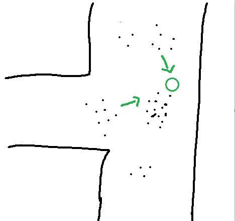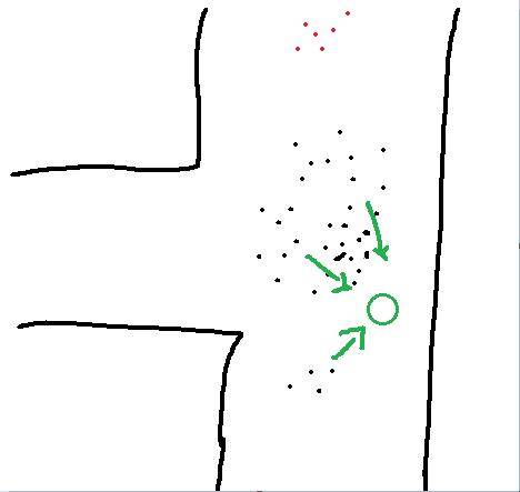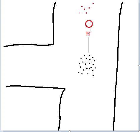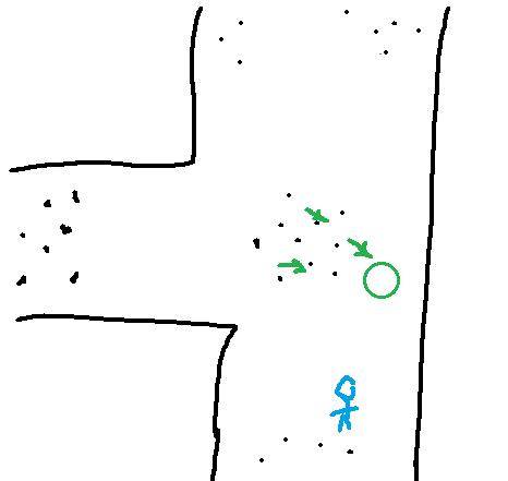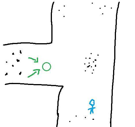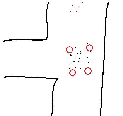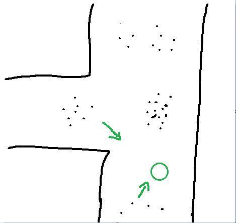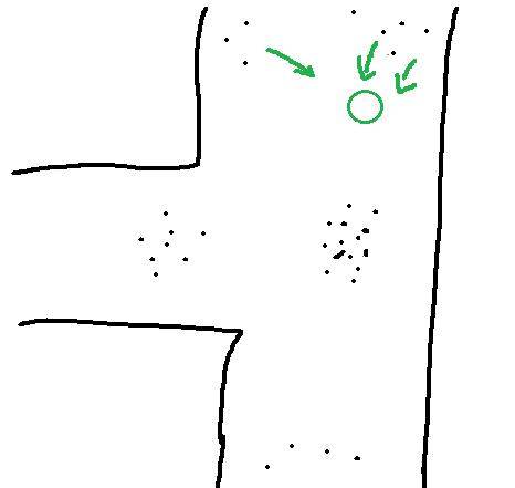 第一步,确定定点位置。如图我们想好了在这个三岔路口聚怪。先黑人在绿色位置站一会,同事黑人射线绕这自己画两个圈,触发怪物的仇恨。同时把主体怪物稍微集中一下。