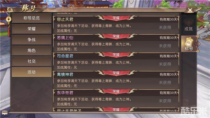 “桃李满天下”活动称号获取:容止天君、若璃上仙、司命星君、离镜神君、东华帝君,参加桃李满天下活动,获得尊上青睐,成为上神。