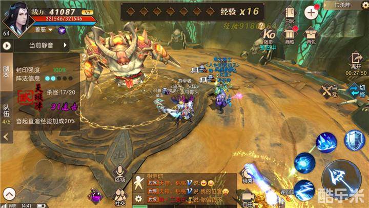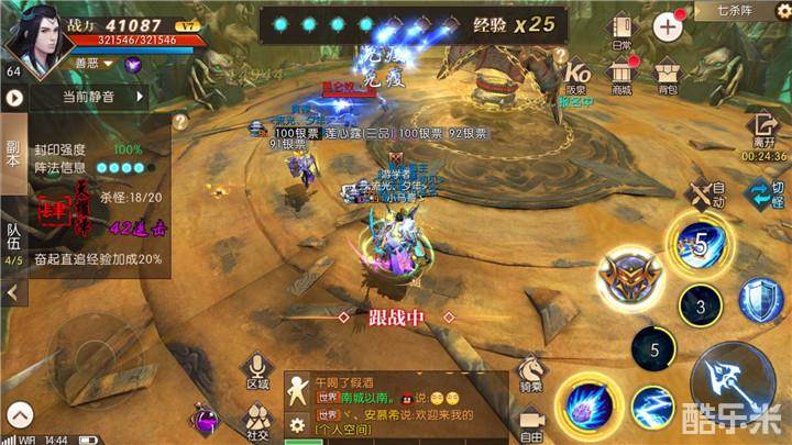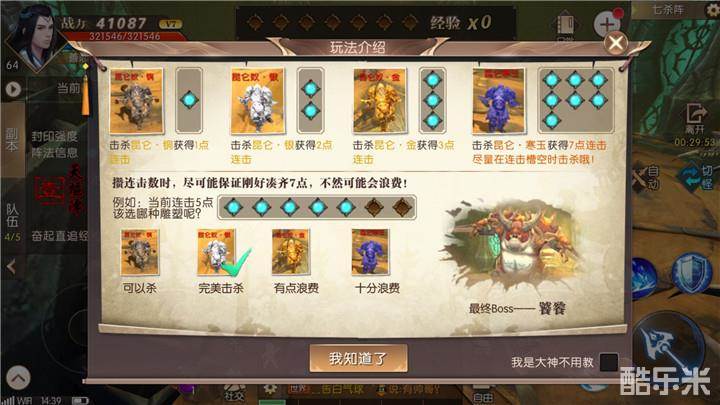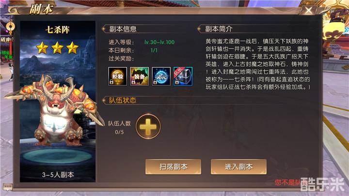 七杀阵副本需要和其他30级及30级以上勇士组成三人以上小队进入。进入副本后会弹出一个副本介绍。击杀昆仑·铜获得1点连击、击杀昆仑·银获得2点连击、击杀昆仑·金获得3点连击、击杀昆仑·寒玉获得7点连击。连击次数越多,经验就越高。勇士在攒连击数时,尽可能保证刚好凑齐7点,不要浪费哦!打昆仑·寒玉时候,尽量在连击槽空的时候击杀。
