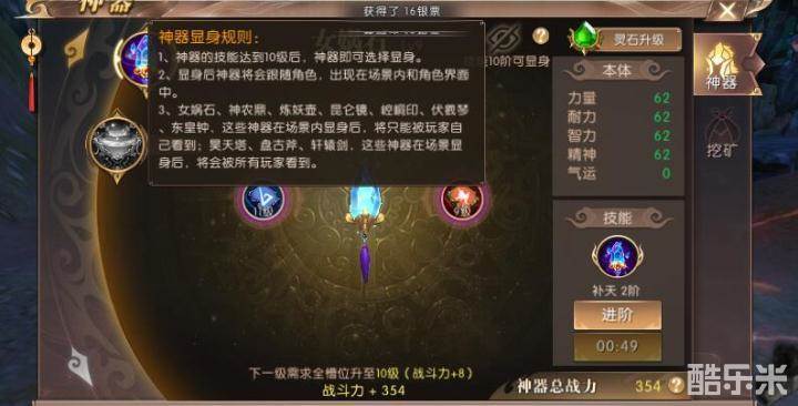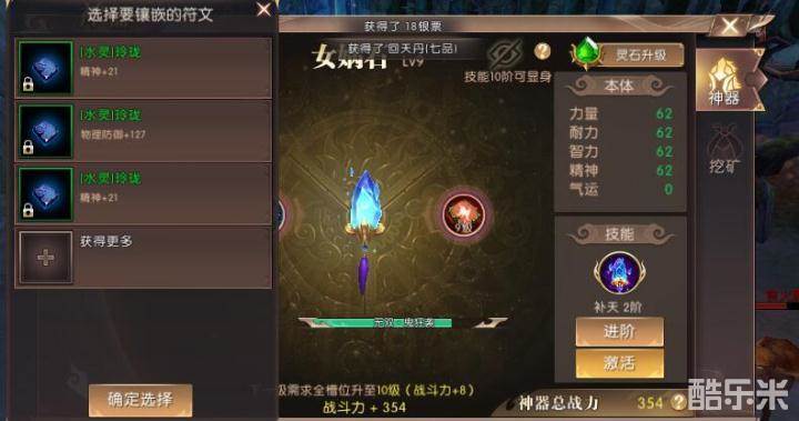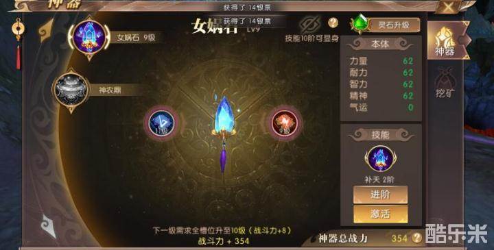 神器的战力提升需要提升多方子系统战力,神器本体战力、符文加成战力和技能战力都会对神器战力造成影响。神器的战力提升需要提升神器的等级,符文加成则需要不断获取更高品级的高级符文,获得更多属性的加成。提升神器的等级就需要不断提升五行灵槽等级,这就需要灵石来帮忙,所以日常活动中一定要专注于灵石的收集,灵槽越到后期需求的灵石数量越多。
