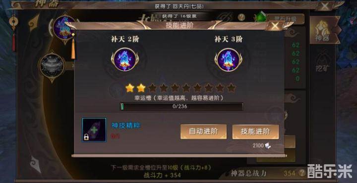 我们知道神器的显身是有一定的规则的,神器的技能达到十级后神器即可选择显身了。神器显身之后就可以跟随角色出现场景和角色界面中了,所以想要神器显身需要提升神器技能等级。点击技能图标下的进阶可以看到神器技能的进阶需要用到神技精粹,在填满幸运槽的过程中幸运值越高技能越容易进阶,进阶到十阶可是需要不少技能精粹的哟。