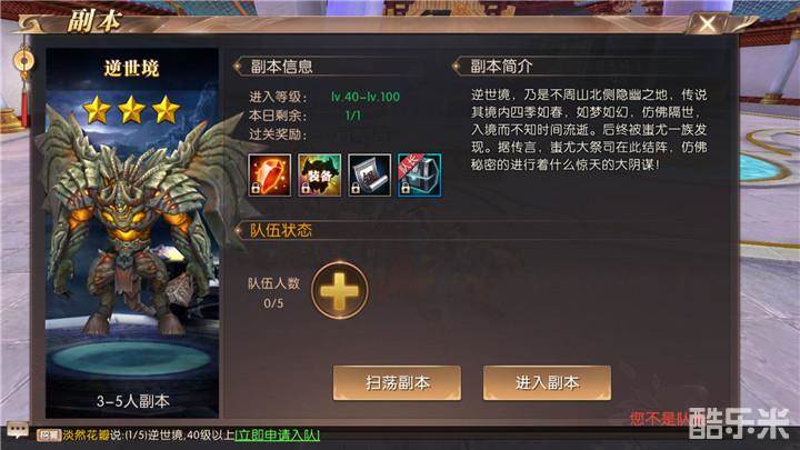 逆世境,乃是不周山北侧隐幽之地。传说其境内四季如春,如梦如幻,仿佛隔世,入境而不知时间流逝。后终被蚩尤一族发现。据传言,蚩尤大祭司在此结阵,仿佛秘密的进行着什么惊天的大阴谋!副本要求40级及其以上勇士组成三人以上小队一起挑战,可以获得宝石及宝石经验、稀有装备等奖励。