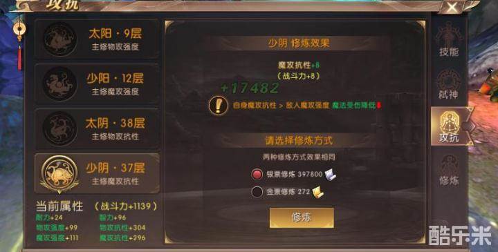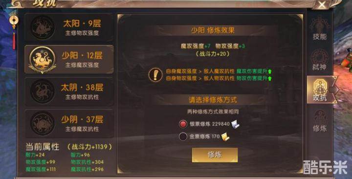 药师职业的强攻修炼与抗性修炼略有不同,抗性修炼可以同步进步,这没什么不对的,但是在强攻修炼上就不能这样照搬了。药师职业是魔法攻击职业,所以修炼魔攻强度才会对提升药师伤害有所帮助,所以在少阳和太阳中我们主修的是少阳,提升魔攻强度。由于金票修炼和银票修炼攻抗的效果是相同的,在有蜃兽招财次数的情况下一般选择将金票兑换成银票,这样提升攻抗会比较划算。