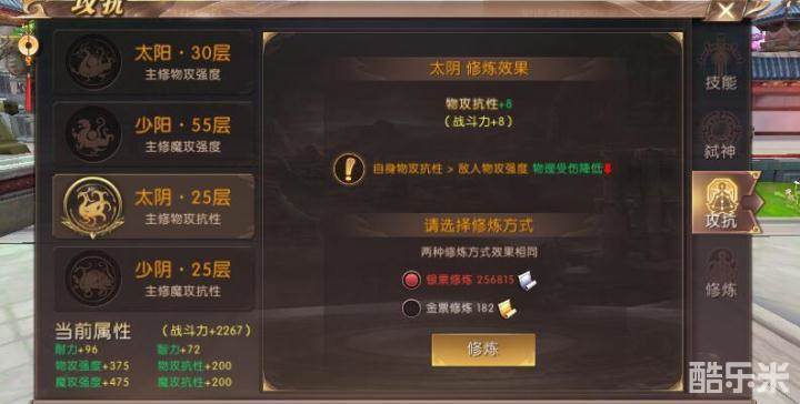 技能分类右侧找到攻抗的修炼界面,太阴和少阴分别对应的就是物攻抗性以及魔攻抗性。刺客职业想要尽量提高自己的伤害就要舍弃一部分的抗性修炼,由于对于物攻抗性和魔攻抗性的需求可以说是基本相同的,所以一般情况下抗性修炼到三百点左右就可以了。当然也可以主修物攻、魔攻抗性中的一种,这种情况是主要对手魔攻强度比较高或者物攻强度比较高的情况下,可以针对性的修炼降低所受伤害。