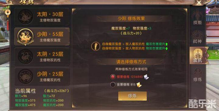 刺客职业的强攻修炼与抗性修炼略有不同,抗性修炼可以同步进步,但是在强攻修炼上就不能这样照搬了。刺客职业是魔法攻击职业,并且非常需要高额的输出,所以修炼魔攻强度会对提升刺客伤害有所帮助。在少阳和太阳中我们主修的是少阳,提升魔攻强度。由于金票修炼和银票修炼攻抗的效果是相同的,在有蜃兽招财次数的情况下一般选择将金票兑换成银票,这样提升攻抗会比较划算。