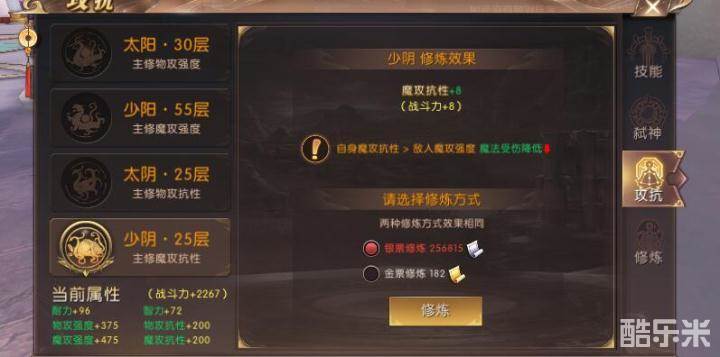 技能分类右侧找到攻抗的修炼界面,太阴和少阴分别对应的就是物攻抗性以及魔攻抗性。战士职业想要尽量提高自己的生存能力就要舍弃一部分的强攻修炼,所以战士对于物攻抗性和魔攻抗性的需求可以说是各职业中最高的。一般情况下战士的抗性修炼要到五百点以上才可以比较合适。当然也可以主修物攻、魔攻抗性中的一种,这种情况是主要对手魔攻强度比较高或者物攻强度比较高的情况下,可以针对性的修炼降低所受伤害。