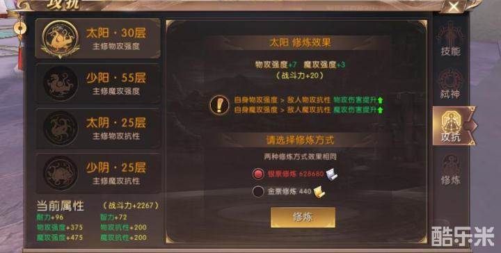 战士职业的强攻修炼与抗性修炼侧重不同,在抗性修炼达到一定阶段之后才会考虑提升强攻。战士职业是物理攻击职业,并不一定需要过高的物攻强度来提高输出,战士本身的技能攻击还是不错的。在少阳和太阳中我们主修的是太阳,提升物攻强度。由于金票修炼和银票修炼攻抗的效果是相同的,在有蜃兽招财次数的情况下一般选择将金票兑换成银票,这样提升攻抗会比较划算。