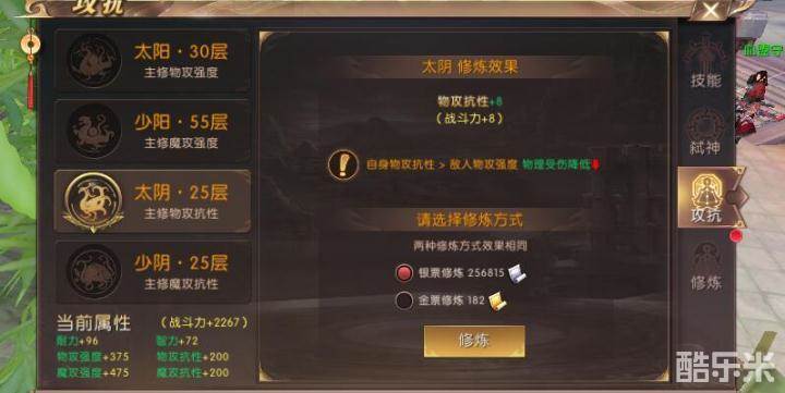 技能分类右侧找到攻抗的修炼界面,太阴和少阴分别对应的就是物攻抗性以及魔攻抗性。天煞职业想要尽量提高自己的生存能力就要提高自己的抗性修炼,所以天煞们对于物攻抗性和魔攻抗性的需求也是相对看重的。一般情况下天煞的抗性修炼要到三百至五百点以上才可以比较合适,因为游戏到了中后期,大部分其他职业勇士们的强攻基本上已经在五百点以上了,选择一个合适自己的抗性值目标就可以了。