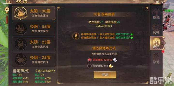 天煞职业的强攻修炼重要度非常高,毕竟天煞不是一个坦克职业,而是需要在战场上打出高额伤害的。天煞职业是物理攻击职业,所以借助物攻强度来提高输出非常有效。在少阳和太阳中我们主修的是太阳,提升物攻强度。由于金票修炼和银票修炼攻抗的效果是相同的,在有蜃兽招财次数的情况下一般选择将金票兑换成银票,这样提升攻抗会比较划算。