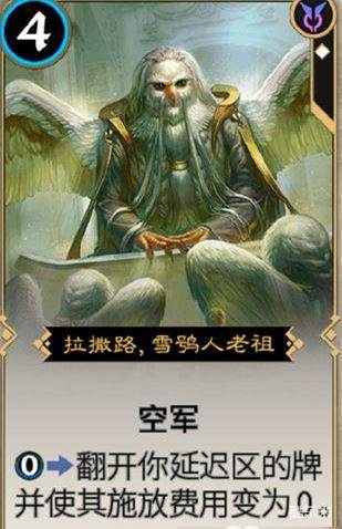 拉撒路·雪鸮人老祖是一张白色传奇卡,4费3/4还算不错,毕竟还有空军加持,同时能力可以让延迟区的卡牌立刻生效,很多人觉得延迟区卡牌立刻生效的价值不大,和直接释放没有什么差别,但游戏中部分法术卡的特殊效果,还是让这张传奇卡有一定作用。