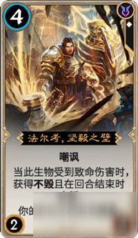 法尔考坚毅之壁是一张防御型的传奇卡,424的身材不算优秀,但特效却无比强大,首先是让队友获得帷幕,避免了各种指向型的法术和技能,同时无论对方多么强大都无法一回合通过他,特殊的不毁能力能让他在受到致命伤害后依旧坚挺到对方回合结束。
