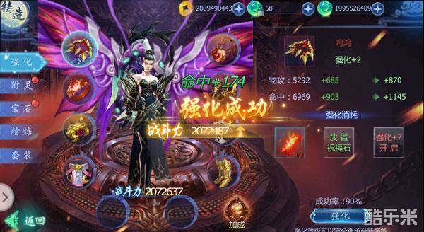 (3)强化成功率,强化有一定的成功几率,强化等级越高成功几率越低,但可以在强化装备的时候放置祝福石提高强化成功率或放置保护符能使装备强化失败时不掉落强化等级;