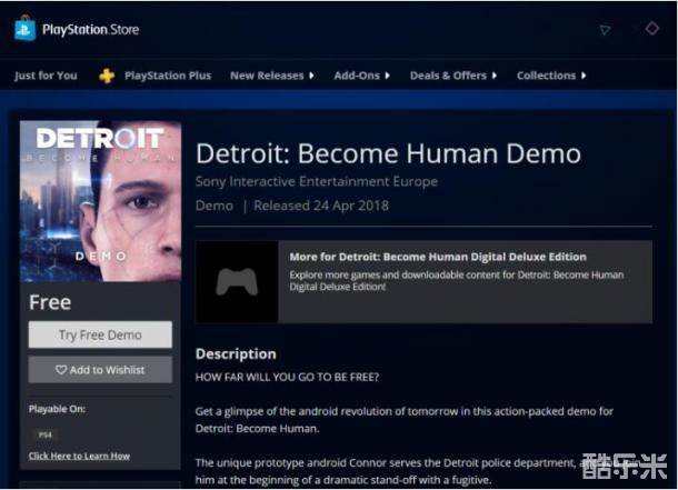 最近外媒PSU发现新西兰PSN商城上架了一个《底特律:变人》的Demo,将于2018年4月24日上线。截止到目前为止,索尼互动娱乐和开发商QD都没有正式公布本作的Demo,看来是官方商城提前曝光了。