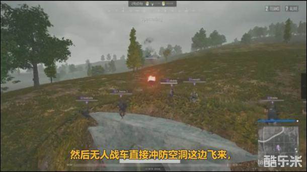 然后无人战车直接冲防空洞这边飞来,这边一队看到飞来一辆车一脸懵逼,以为遇到bug,还想集火打爆,但无人车被打的冒着火依然横冲直撞。