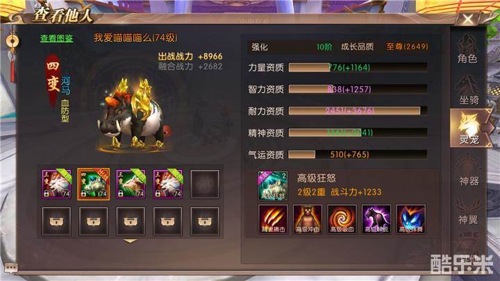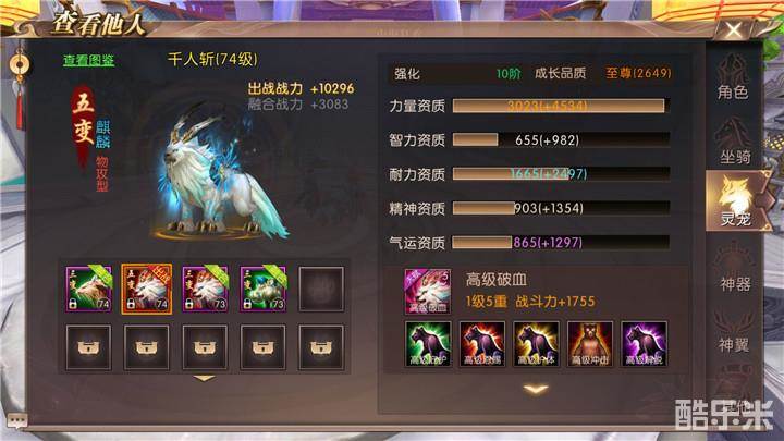 麒麟是吉祥神宠,外形有点像狼却有不似狼。头上有尖尖的角,嘴里还有两根长长的獠牙。脖子有一圈青灰色毛发,尾巴和颈圈的毛发颜色一样。55级勇士就可以携带麒麟了。麒麟变异后可以分为初代麒麟、一阶裂地、二阶追风、三阶日炎、四阶月霜、五阶雷霄。麒麟自带天赋技能破血:攻击时必然获得破血状态,使得自身物理和魔法攻击均提升2%。天赋技能破血可以升级,每升一重,技能状态可叠加一层。麒麟自带天赋技能高级破血:攻击时必然获得高级破血状态,使得自身物理和魔法攻击均提升3%。天赋技能破血可以升级,每升一重,技能状态可叠加一层。麒麟主加力量和耐力资质,属于物攻型灵宠。目前在游戏中麒麟最受幻弓、战士、天煞勇士的欢迎。