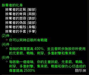 掠夺者的化身,资料片后DH的第一个职业套装,风光无限的自动挡大箭塔,曾经是DH玩家心目中的终极装备,带给DH玩家无限美好回忆。 然而随着大箭塔的落寞,掠夺者套一直处在很尴尬的地位,逐渐淡出了DH玩家的视野。 在即将到来的2.6.1版本,随着掠夺者套装和蝎尾狮的大幅加强,掠夺集束有望重回巅峰。