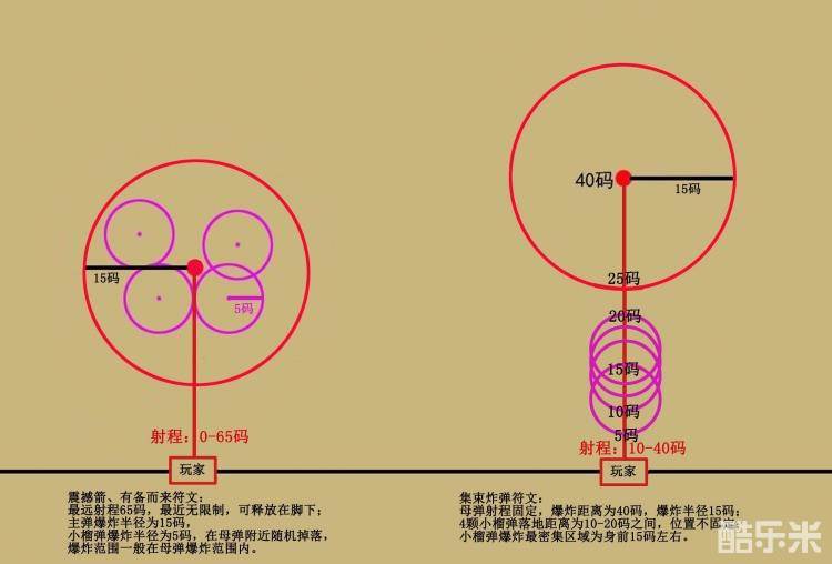 集束炸弹符文:母弹第一落点固定35码,然后会弹跳一次,在约40码处爆炸;子榴弹个数为4颗,在10-20码之间随机掉落,偏离主轴最大距离为3码。最密集攻击范围为身前15码左右,集束箭攻击范围详见以下示意图:
