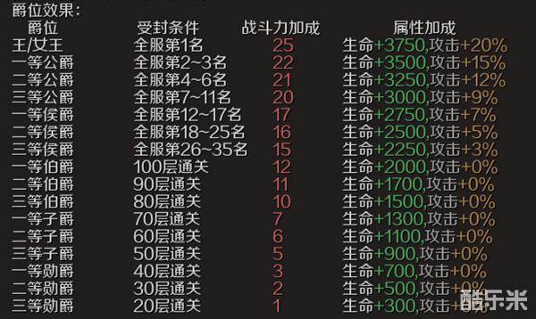 伯爵、子爵、勋爵爵位无受封人数,可以通过挑战恶魔塔的特定层数获得。像王爵、公爵、侯爵由一等伯爵中产生,按照挑战层数高低,并有受封人数限制,挑战层数相同的勇者,排名以完成挑战时间点的先后顺序决定。