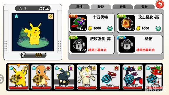 皮卡丘作为一只电系的宠物小精灵拥有着四大技能:十万伏特、攻击强化-高、法功强化-高、圣佑后两个技能只有当小精灵到达3星和4星以后才能开启。皮卡丘的后期伤害技能更多的需要依靠法攻的支撑,配合高等级的装备将能打出一波不错的伤害。