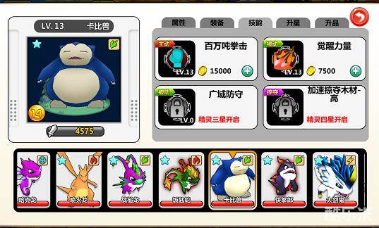 卡比兽作为小智最强的小精灵之一当然也出现在了游戏中,而获取卡比兽的方法非常非常简单,只要第一次十连就一定会召唤出这个顶级资质的超强小精灵。卡比兽的四个技能分别为:百万吨拳击,觉醒力量,广域防守,加速掠夺。
