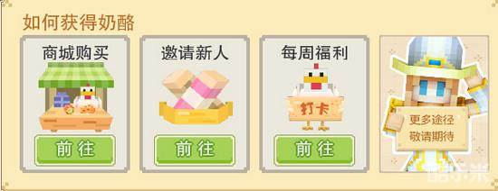 奶块奶酪的获得方式目前有四种:每周福利免费领、村庄任务活跃度170以上、商城购买、邀请新人。