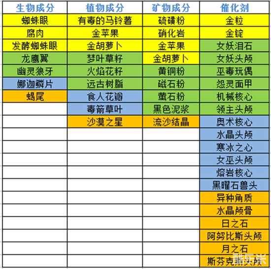 4种炼金材料:生物材料、矿物材料、植物材料、催化剂