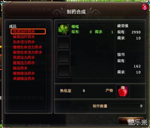 制作界面左边可以查看该技能所有的合成产物。选中后右侧出现所需原料图标,并显示所需原料数量和背包中该原料的数量。