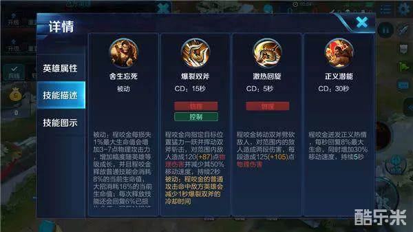 一技能-爆裂双斧:程咬金朝指定方向跳跃,对范围内敌人造成物理伤害与减速效果。被动:程咬金的普通攻击命中敌方英雄后,会减少一技能的冷却时间。