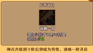 当神兵升级到十阶后就可以解锁谋略一阶:属性为征战中己方军师基础攻击的3%。