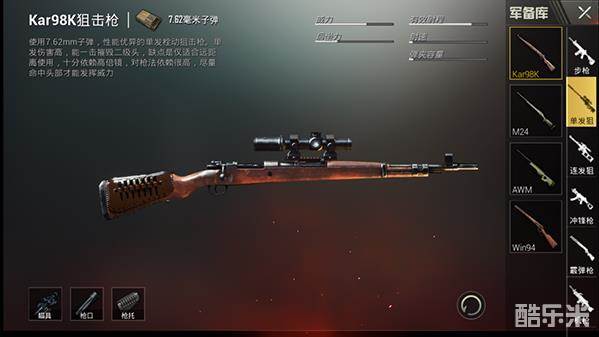 新版本中增加了资料一应俱全的军备库。军备库展示了游戏内所有的枪械、近战武器模型及其属性。玩家可以在军备库中调整武器配件,来查看不同配置下的武器属性。以下图为例,详细展示了毛瑟98K枪支的五维属性与适配零件。