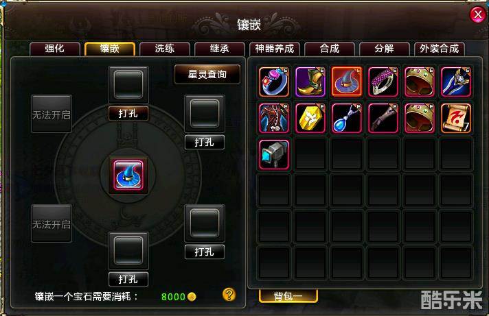 特定的宝石组合可以触发“星灵”效果,点击镶嵌面板上的“星灵查询”按钮可以查看宝石组合。