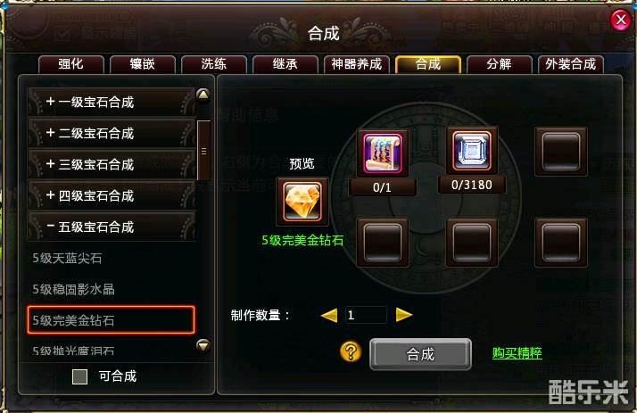 使用【L】键打开合成面板,合成1-5级的宝石分别需要1个对应等级的宝石合成卷轴和数量不等的宝石精粹或高级宝石精粹(根据宝石的名贵程度)。