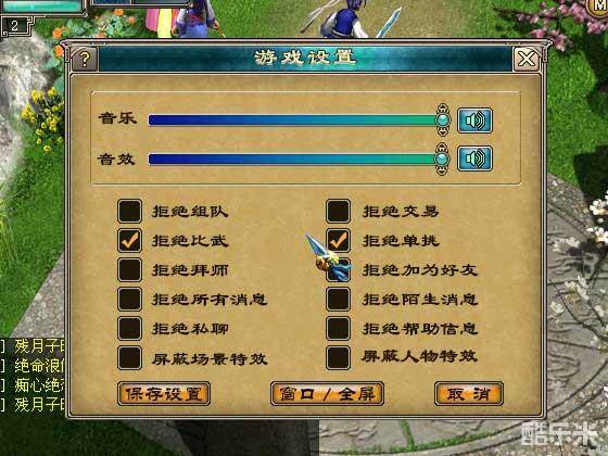 游戏中可以通过系统设置来调整画面、声音方面的一些属性和某些状态的设定。其主要功能包括音乐开关、音效开关、音量大小调节、拒绝组队开关、拒绝交易开关、拒绝比武开关、拒绝单挑开关、拒绝拜师开关、拒绝加为好友开关、拒绝所有消息开关、拒绝陌生消息开关、拒绝私聊开关和拒绝帮助信息开关。按ESC键可以进入系统设置画面。