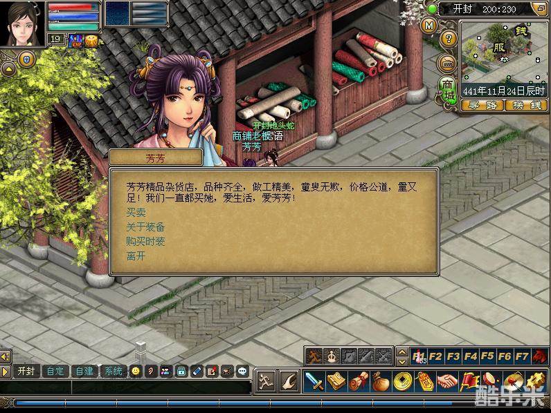 游戏中玩家需要购买常备的装备时,只需要找到位于开封的芳芳(200,231)就可以买到需要的物品。