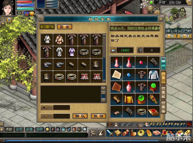 点击“买卖”,即可打开物品购买界面,在商铺购买到各种物品。将鼠标移到物品图片上可以查看到关于该物品的详细描述。单击物品后,选择要购买的数量,确认付款完成交易。