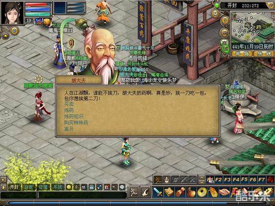 俗话说:“人在江湖走,哪有不挨刀?”玩家在游戏中只需要找到位于开封的胡大夫(232,272)就可以买到常用的必备药品。除了买卖补给药品外,胡大夫还提供炼药功能,只要玩家的等级达到32级,就可以拿相应的材料来换取特殊的药品。