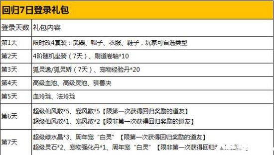道友若初次回归,则可领取初次回归七日礼包,若非初次回归,则可领取普通回归七日礼包,回归期间,一周礼包不重样,每天都有新惊喜,重要的是在第七天登陆还可领取2周年纪念宠物“白灵”。