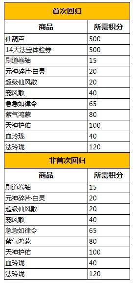 符合回归资格道友,与其他道友组队,参与除暴、修行、十绝阵、押镖、副本、通天塔和刷道(包含降妖、伏魔、飞仙渡邪),在每场战斗结束时若战斗胜利,则玩家自身可获得1点回归积分奖励,另外,非回归道友在2018年04月27日-05月11日成功召回道友重返游戏,还可获得100积分,积分可在开启的积分商城兑换丰富的奖品!