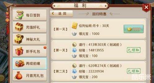 回归期间还有特惠购,花小钱获得海量经验、道行,祝您突飞猛进。还可购买位列仙班特权时间,获得大量银元宝返利!7天每天可购买的特惠内容都不重样,且仅可使用金元宝购买。