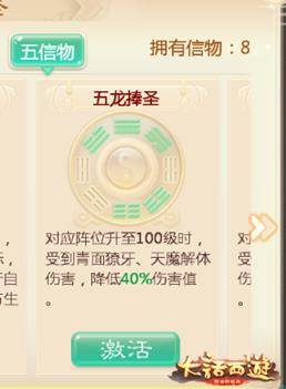 点击我的阵法,我们可以清晰的看到所有的阵法,有一信物阵法,二信物阵法一直到五信物阵法。激活阵法的方法其实很简单,直接点击激活就可以了。当然用越多信物激活的阵法,威力相对而言也会越强大。不过很多阵法都是有偏向性的,比如更加偏向于敏控制或者血单位等等,大家可以根据自己的需求去搭配适合自己的阵法。我们目前能看到的阵法显示的数值是当对应阵位升级到100级时候的效果,也就是最终所能达到的阵法效果的最佳值。