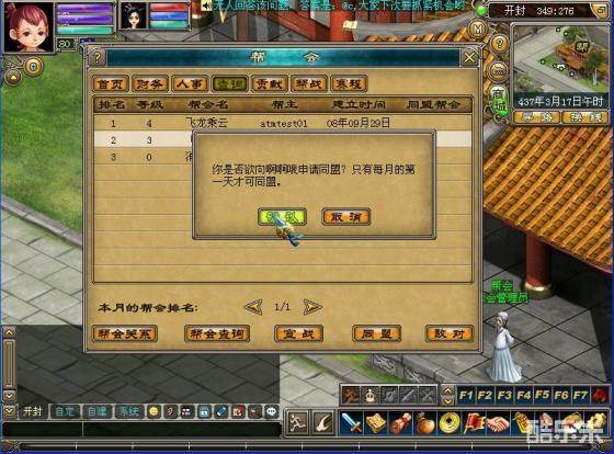 申请同盟:正式帮会可相互同盟间同盟,任何帮会的同盟帮会只能有一个,同盟帮会可帮助自己的盟友进行帮会战,山寨战。